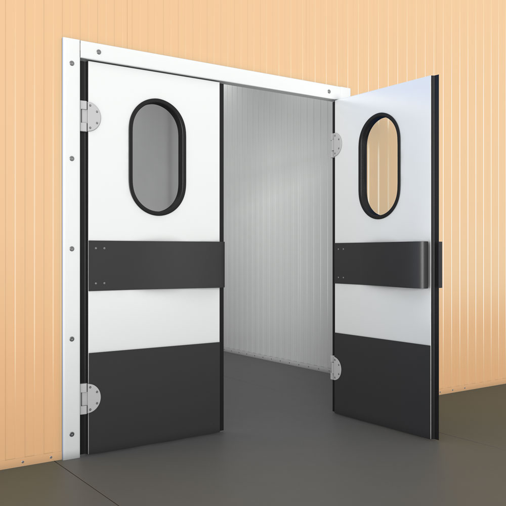 Маятниковые двери предназначены для разделения производственных и других помещений с одинаковым температурным режимом в местах с интенсивным проходом персонала. Для удобства предусмотрена фиксация створок под углом 90°.