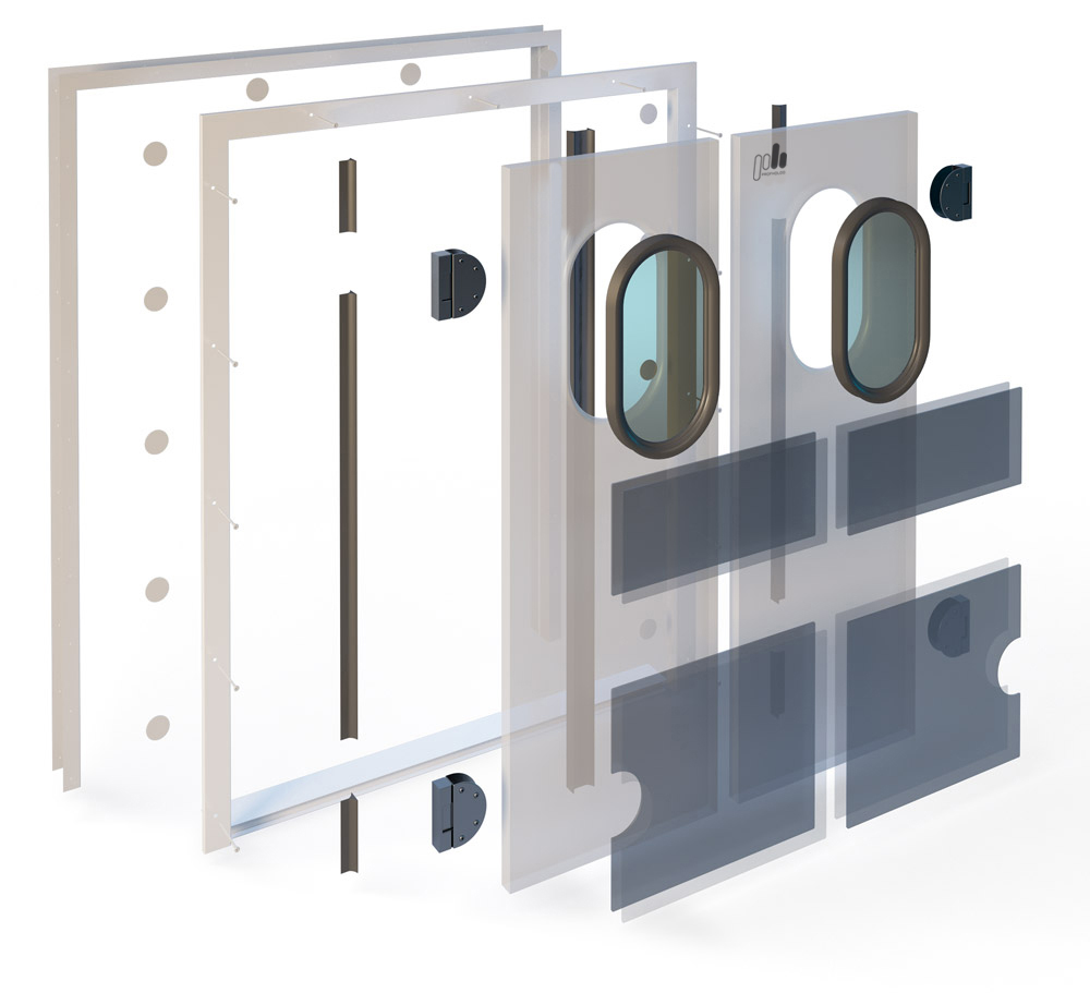 В зависимости от степени агрессивности рабочей среды возможно изготовление дверей из нержавеющей стали марки AISI 304 для пищевых продуктов или AISI 430 для непищевых. Внутренние закладные элементы дверного полотна обеспечивают надежное крепление фурнитуры. Все двери комплектуются эластичным уплотнителем. Защиту дверного полотна от повреждений обеспечивает специальная полиэтиленовая пленка толщиной 50 мкм, которая свободно удаляется после монтажа.