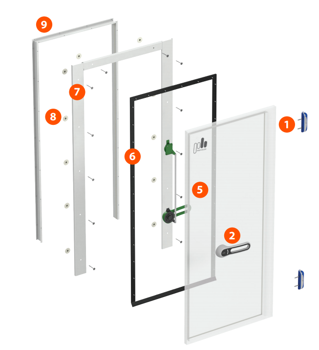 Надежное крепление фурнитуры обеспечивают внутренние закладные элементы дверного полотна. В комплект низкотемпературных дверей и дверей шоковой заморозки входит дополнительный подогрев периметра проема — электронагревательный провод, ПЭН.